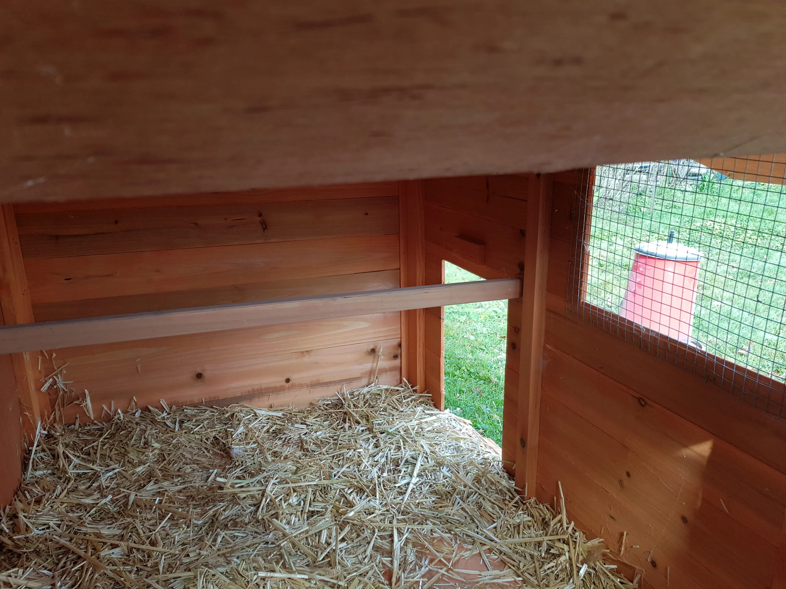 - un perchoir : les poules s’y perchent la nuit pour se sentir en sécurité. Il faut prévoir environ 25 à 30 cm pour chaque poule sur le perchoir.